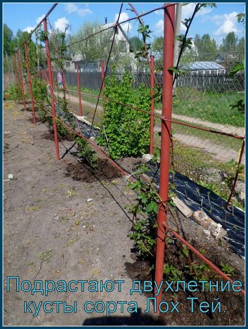 3). В первый год посадки, пока растения небольшие, шпалера им не нужна, но уже через год нужно будет установить шпалеру высотой, примерно, 1,8 м. (на фото однолетний кустик сорта Апачи).