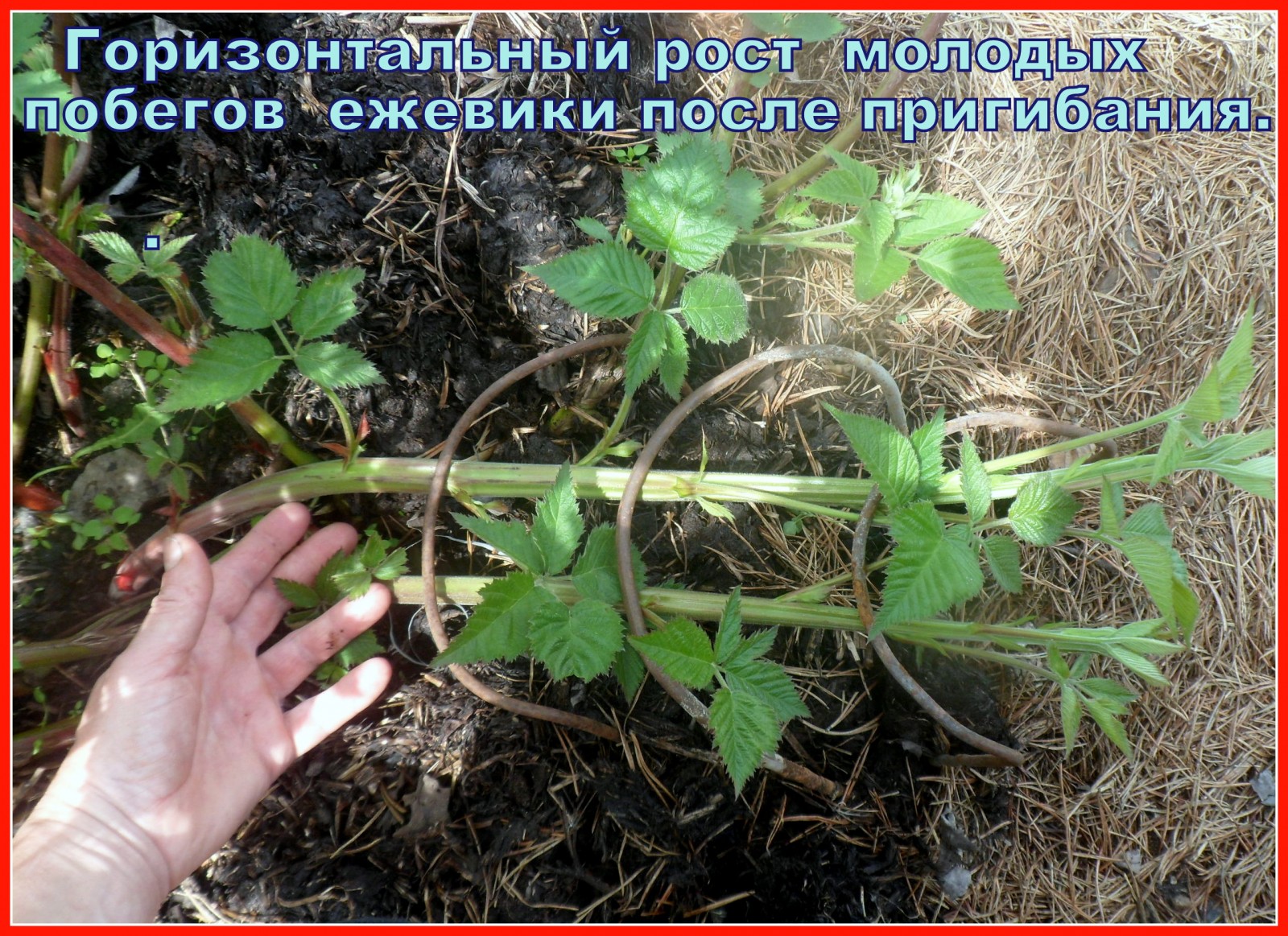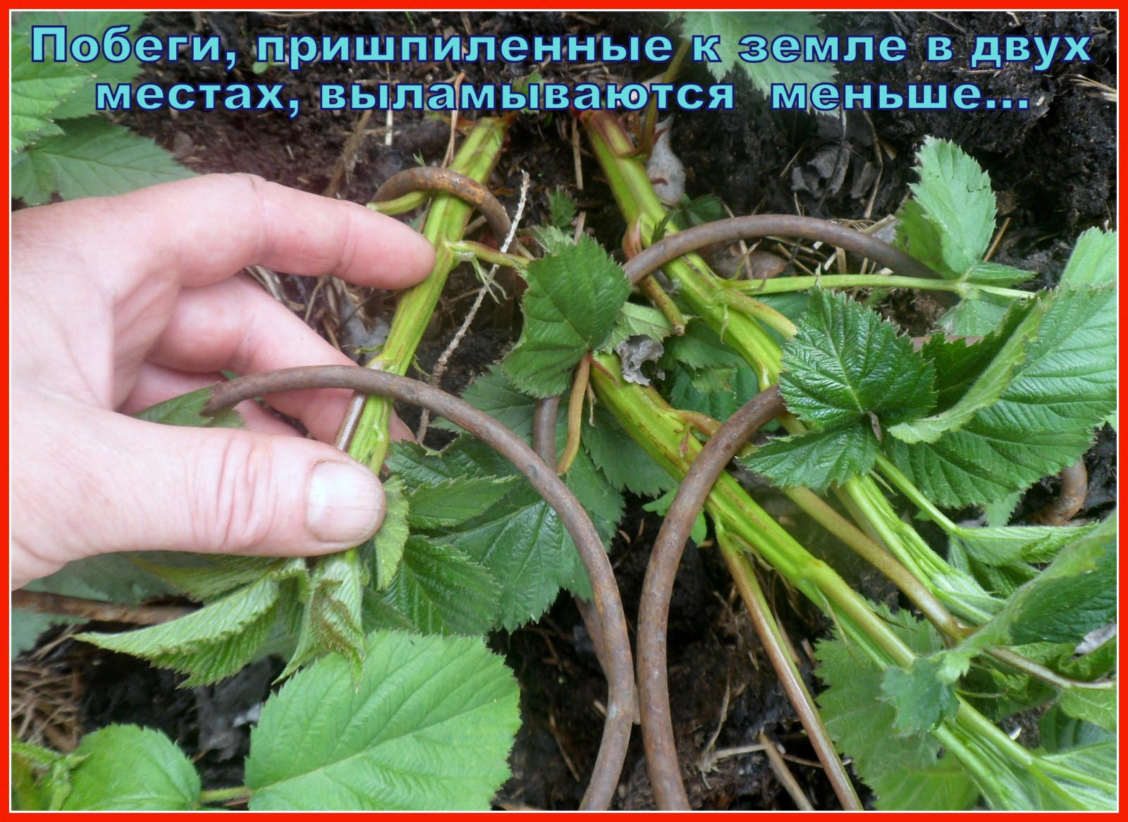 9). По достижению молодых побегов высоты 15-20 см. их обязательно пригибают крючками или металлическими шпильками, заставляя расти горизонтально земле. Это делается для того, что бы осенью можно было правильно и удобно укрыть кусты на зиму, т.к. к октябрю ежевичные побеги одревеснеют, станут мощными и толстыми и пригнуть их под укрытие будет проблематично.